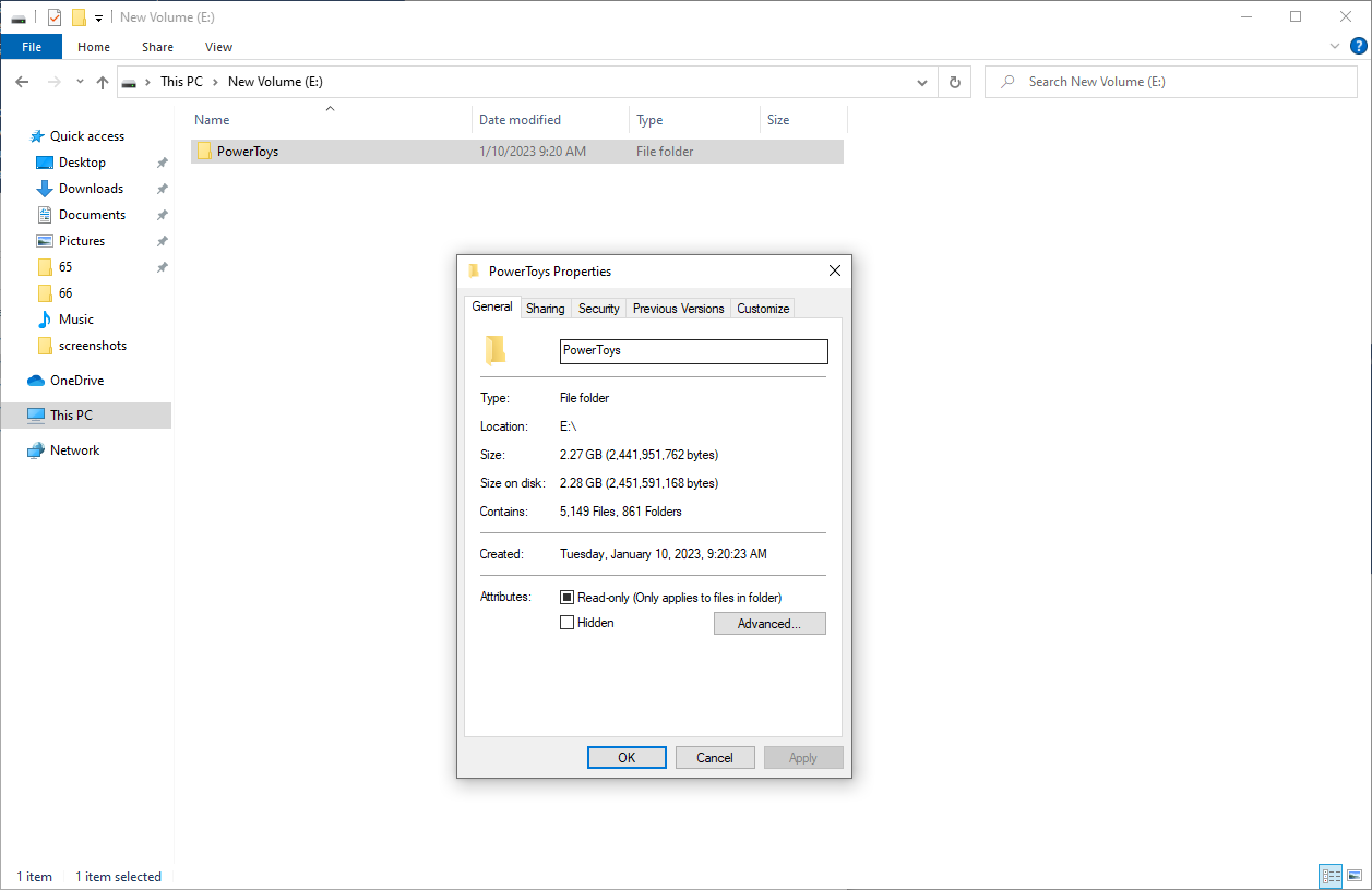 WAS, VCRedist, .NET | 149 MB | 705 MB | 1,760 MB | 557 MB | 0 MB | 706 MB | ## Our process to verify current install footprint We created a quick virtual machine. We chose to use our fresh Windows 10 test virtual machines here. ### Empty disk details ### Install PowerToys to empty disk ### PowerToys installation directory size shown by File Explorer As mentioned above, File Explorer shows size of PowerToys installation dir as every hard-link is a regular file for itself ### PowerToys size shown by App->Installed apps ### Disk usage with PowerToys installed Real disk usage of PowerToys is shown by inspecting disk usage after installing PowerToys. Used space is now 695MB, comparing to ~35MB used space for empty disk gives us the size of ~660MB for PowerToys installation dir. ### PowerShell command calculating size of non-hardlinks files Size of regular files (non-hard-links) and hard-links can also be obtained by running following PowerShell command in PowerToys installation dir: ``` Regular files: ls -Recurse -File -force -ErrorAction SilentlyContinue | ? LinkType -ne HardLink | Measure-Object -Property Length -Sum Hard-links ls -Recurse -File -force -ErrorAction SilentlyContinue | ? LinkType -e HardLink | Measure-Object -Property Length -Sum ``` Running these commands for PowerToys v0.66 shows that size of regular files is way less than size of hard-links pointing to some of those regular files because PowerShell (same as File Explorer) also takes the size of hard-links as of regular files.