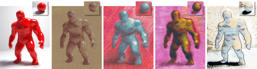 This example shows how to achieve a non-photorealistic rendering with ebsynth. It is based on the work of Fišer et al. [7]. The goal is to render a 3D model like an artist would do. Specifically, we want to capture the way how an artist conveys the different illumination effects, like highlights, contact shadows, and indirect bounces. To that end, we set up a simple reference scene with an illuminated ball, and let the artist draw it in her/his style. We use an off-the-shelf path tracer to produce the separate render passes, e.g., full global illumination, just the direct diffuse component, just the indirect bounce, etc. Next, we render the same set of passes for the target 3D model and use them as guides for ebsynth.